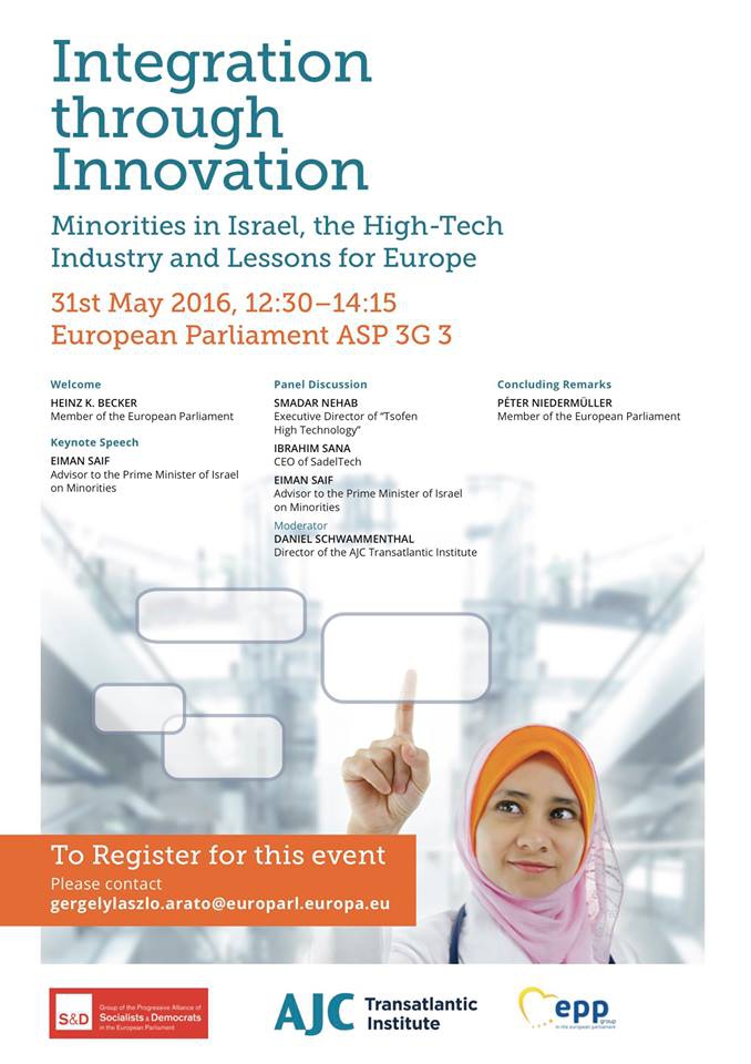 The AJC Transatlantic Institute and MEP’s Péter Niedermüller and Heinz K. Becker co-organized the event "Integration Through Innovation: Minorities in Israel, the High-Tech Industry and Lessons for Europe” in the European Parliament.