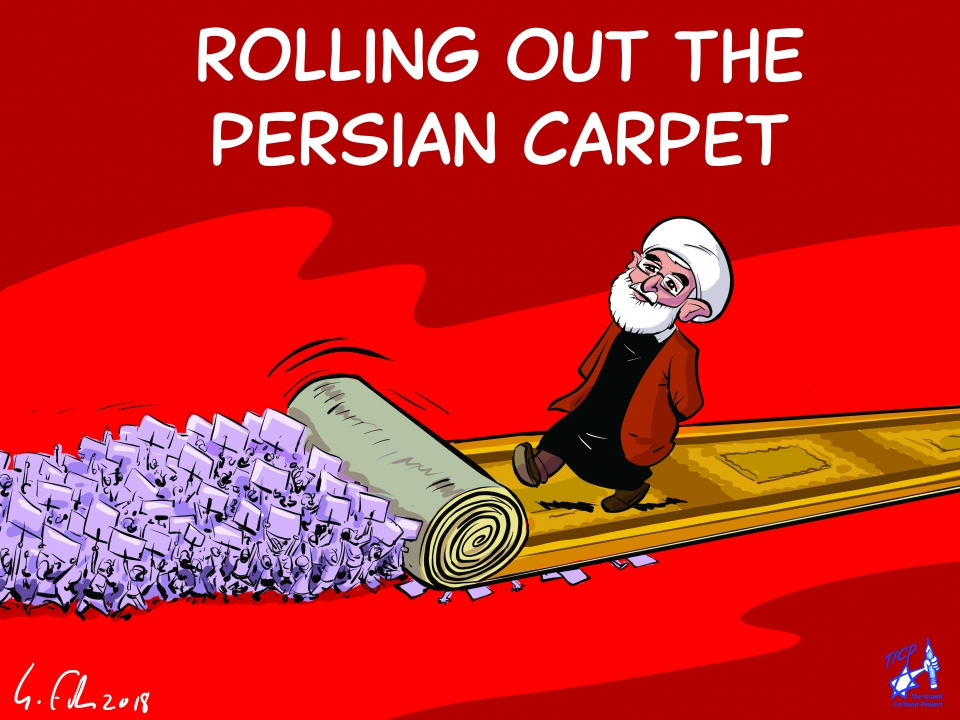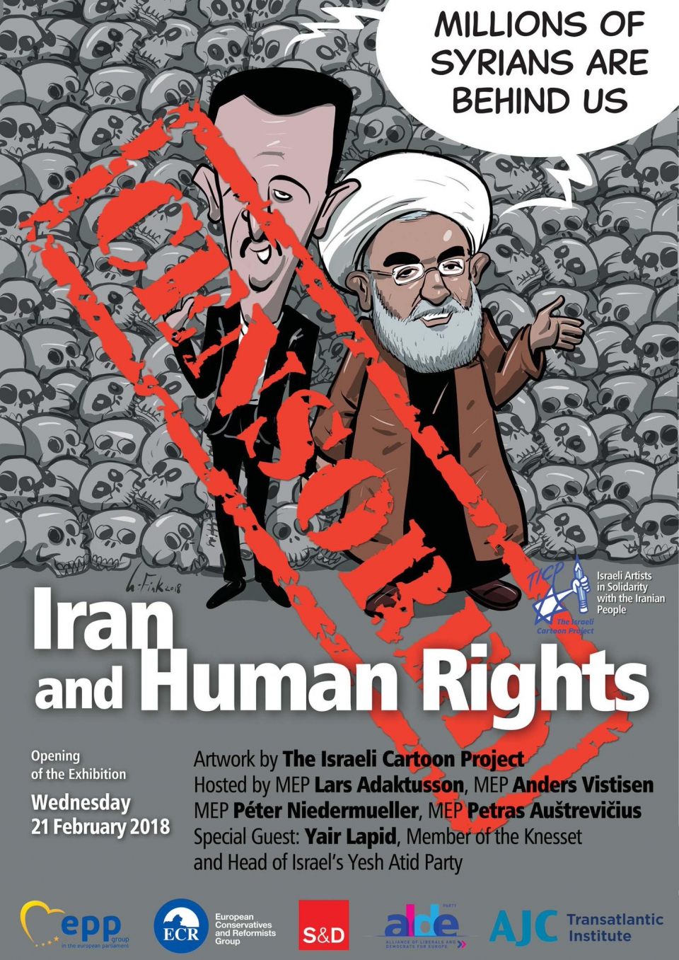 Suppressed in its entirety by the British Liberal Quaestor Catherine Bearder on the grounds of being “controversial,” the four Members of Parliament co-hosting the exhibit—Lars Adaktusson (EPP), Péter Niedermüller (S&D), Anders Vistisen (ECR) and Petras Auštrevičius (ALDE)—had to relocate the installation ”Iran and Human Rights” to an adjacent venue. The exhibition features satirical cartoons by the The Israeli Cartoon Project, a group of artists who consider their work an act of solidarity with the Iranian people.