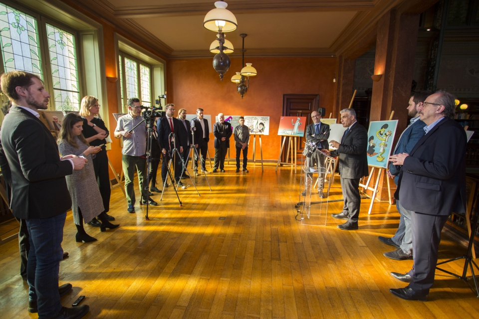 After the European Parliament‘s Quaestor, British Liberal Catherine Bearder, banned the cartoon exhibition "Iran and Human Rights" as too “controversial,” the AJC Transatlantic Institute along with the four Members of Parliament co-hosting the exhibit—Lars Adaktusson (EPP), Péter Niedermüller (S&D), Anders Vistisen (ECR) and Petras Auštrevičius (ALDE)— relocated the installation to the Bibliothèque Solvay.