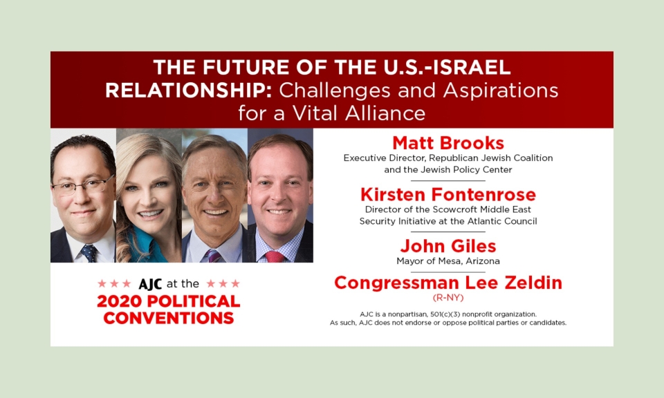 The U.S. and Israel share democratic values, strategic interests, and a historic, multi-dimensional partnership that has long enjoyed bipartisan endorsement. At last week’s Republican National Convention AJC joined Executive Director of the Republican Jewish Coalition and the Jewish Policy Center Matt Brooks, Director of the Scowcroft Middle East Security Initiative at the Atlantic Council Kirsten Fontenrose, Mayor John Giles of Mesa, Arizona, and Representative Lee Zeldin for a conversation on the state of U.S.-Israel relations and the challenges and aspirations for the next four years.