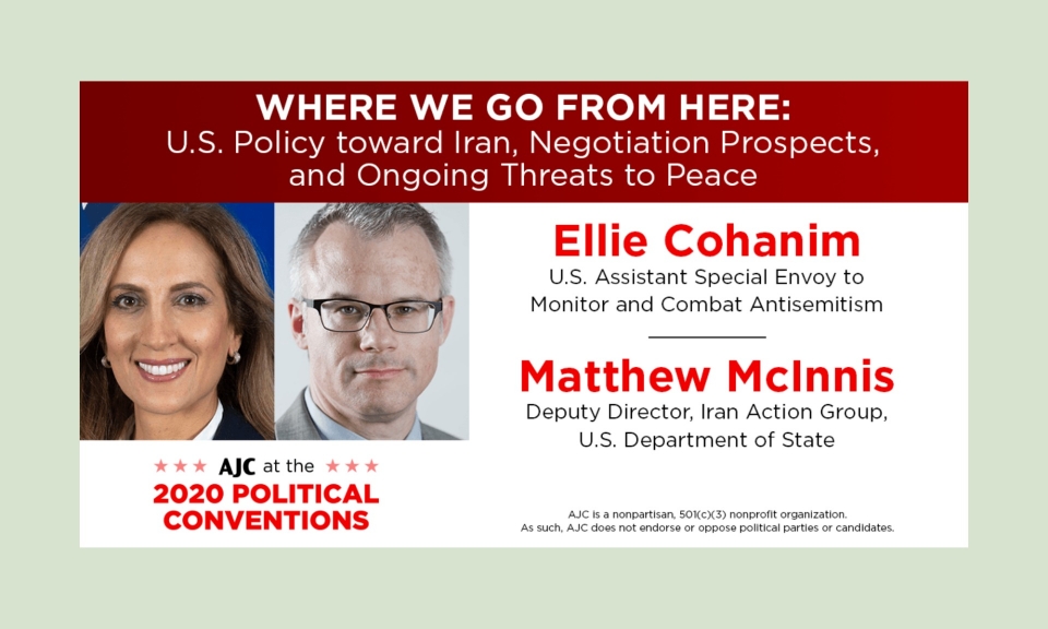 The UN arms embargo on Iran is set to expire this October. What are the options to build an effective strategy to address the Iranian regime’s ongoing conventional and non-conventional threat? AJC hosted Ellie Cohanim, U.S. Assistant to the Special Envoy to Monitor and Combat Antisemitism, and Matthew McInnis, Deputy Director, Iran Action Group at the US Department of State, for a discussion on the Republican perspective on how to counter Tehran’s regional aggression and ballistic missile development – areas unaddressed in the 2015 nuclear deal.