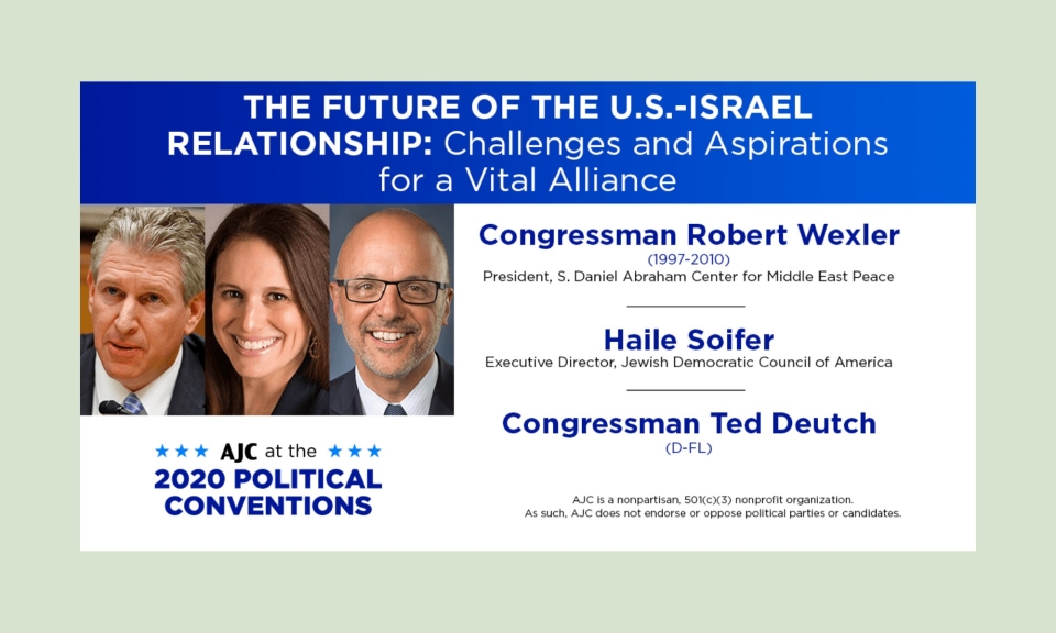 Can we continue to rely on the U.S. bipartisan agreement on the benefits and necessity of the alliance with Israel? At this year’s Democratic National Convention AJC discussed with Representative Ted Deutch, Executive Director of the Jewish Democratic Council of America Halie Sofer, and President of the S. Daniel Abraham Center for Middle East Peace Robert Wexler how America’s critical ties with the Jewish state will evolve.