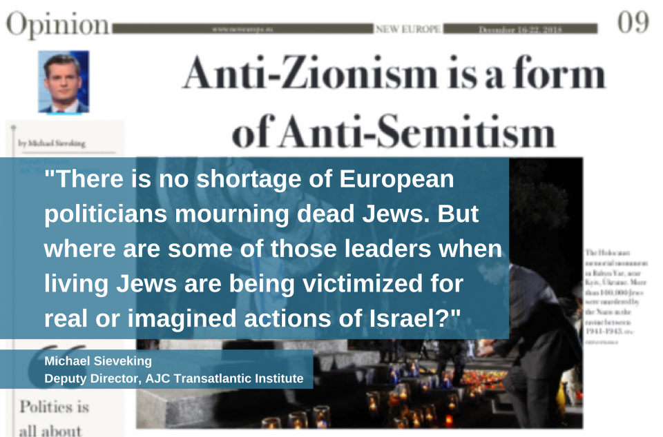 Writing in “New Europe,” Michael Sieveking, Deputy Director of the AJC Transatlantic Institute, urges EU Member States to adopt and fully implement the IHRA Working Definition of anti-Semitism, which includes a provision on anti-Zionism.
