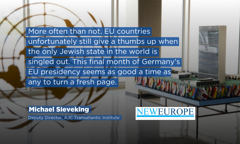 The UN General Assembly is poised to pass a total of 17 resolutions targeting Israel while omitting Palestinian terror and attempting to erase the millennia-old Jewish ties to Jerusalem. In comparison, the world’s worst human rights abusers like Iran will get a slap on the wrist. Writing in New Europe, the AJC Transatlantic Institute’s Deputy Director Michael Sieveking calls on the EU – currently under Germany’s presidency – to oppose this diplomatic assault on the Jewish state.